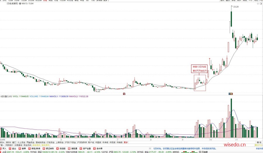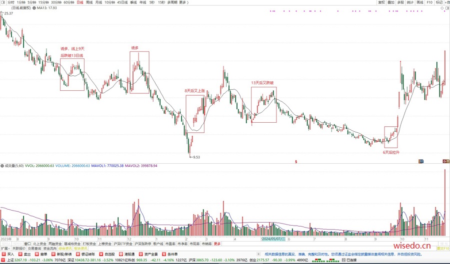 需要重点注意的是:在下跌趋势的熊市中,主力有时突破13日线,但9天或者13日之后,又跌破13日线,形成诱多,持续原来的下跌趋势,而且这种形态在熊市行情有80%左右会发生,真正能出现右侧交易形成主升行情的只有20%左右。如果出现政策面的变化,出现的短期大盘资金的脉冲,这种右侧交易成功概率大于90%以上。 均线系统普遍有滞后性,具体使用要结合市场热点和大盘情况结合使用。