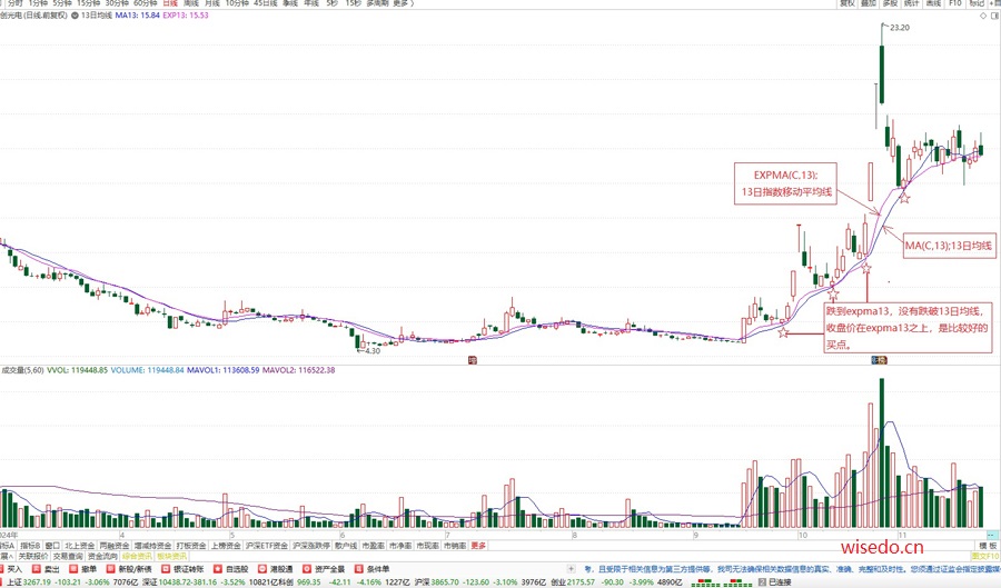 3、实际使用中,买入可以看EXPMA13,即13日指数移动平均线,卖出看13日均线为参考。