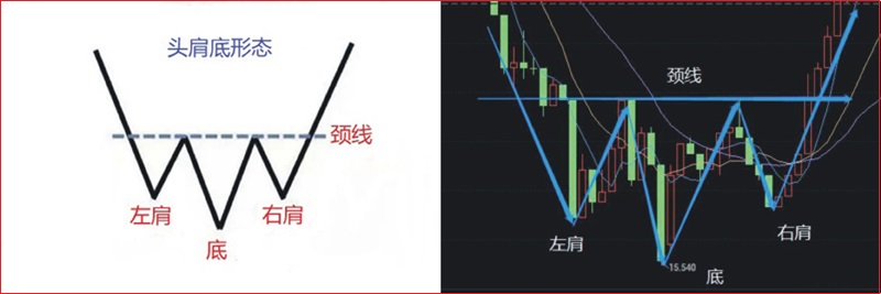 头肩底是最为人熟知而又最可靠的主要反转形态,其它的反转形态大都仅是头肩型的变化形态。头肩底反映市场情绪由空转多:左肩和头部释放抛压,右颈缩量表明空方衰竭,突破颈线后多头占据主导,开启上涨趋势。其有效性需结合趋势、量能和市场环境综合判断。