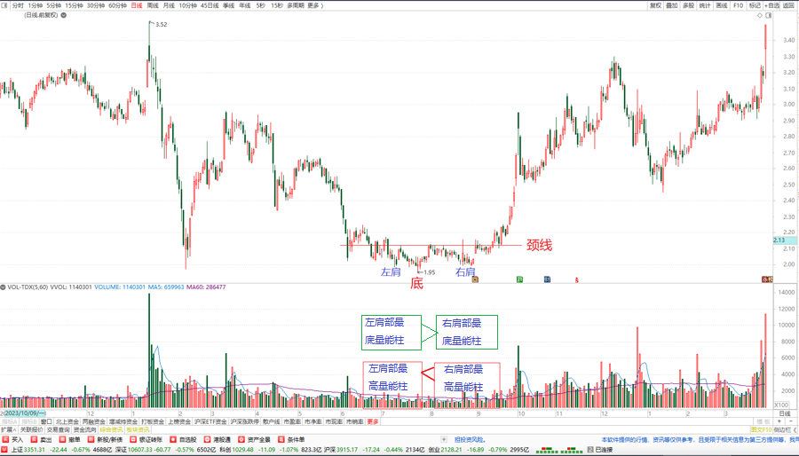 2、头部 股价再次下跌并跌破左肩低点,形成更深的第二个波谷;此阶段成交量通常较左肩阶段更大,反映抛压加剧后的触底反弹。