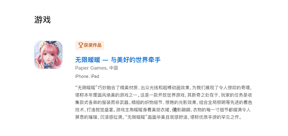 国内玩家非常熟悉的《无限暖暖》获奖了。这是一款开放世界换装角色扮演与冒险游戏,是暖暖系列中第五代作品,视效与互动都十分精美细腻。玩家在游戏中扮演暖暖,换上魔法服装,与大喵展开冒险旅程。