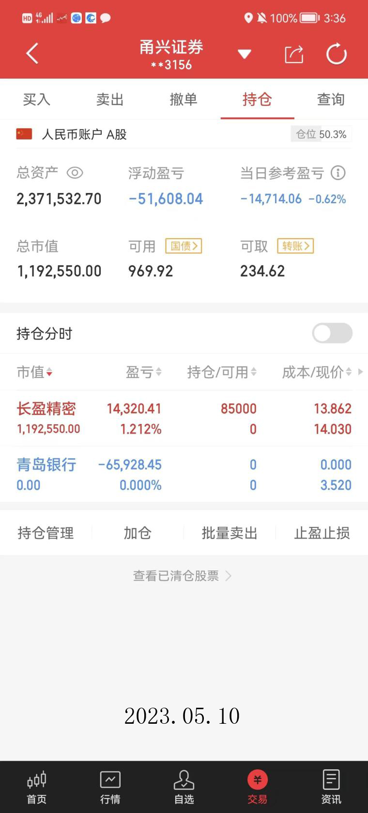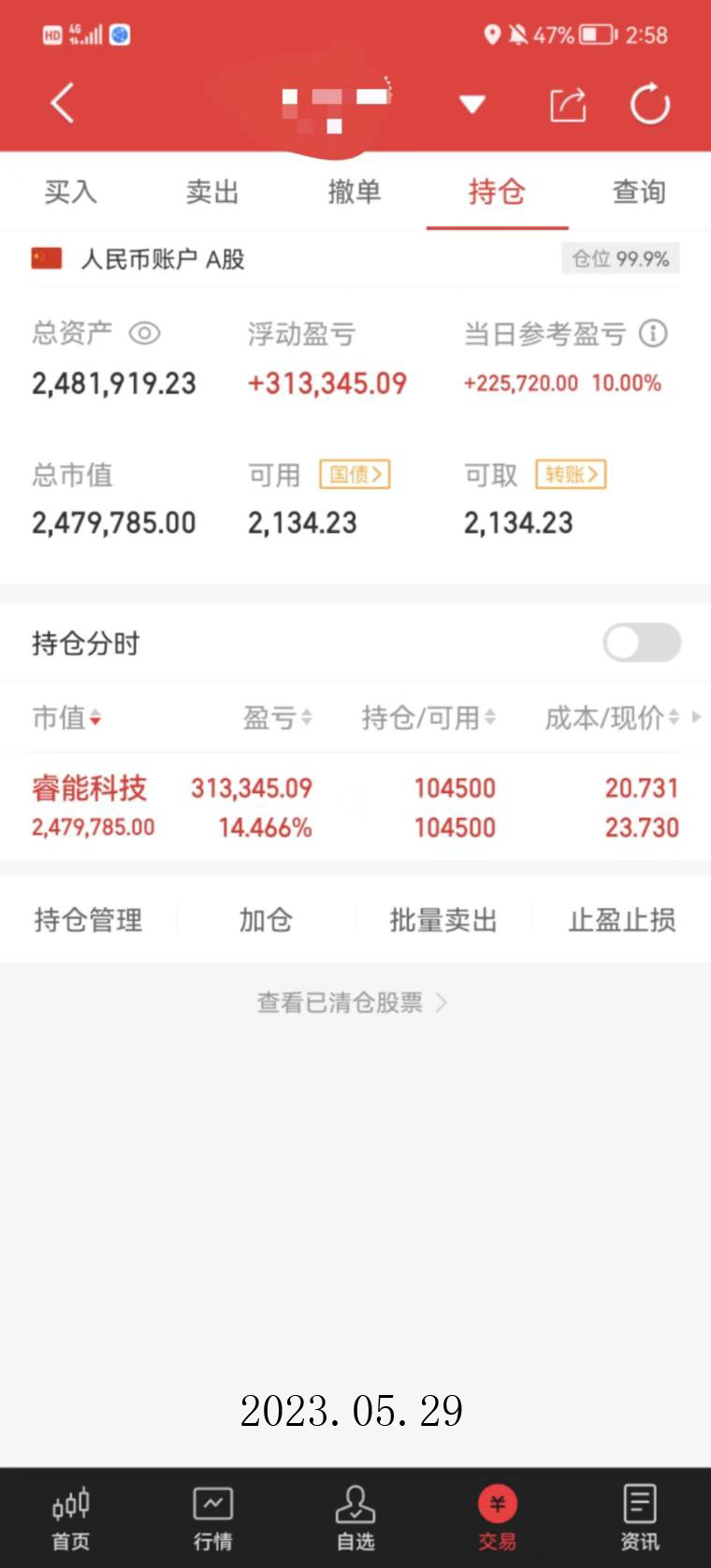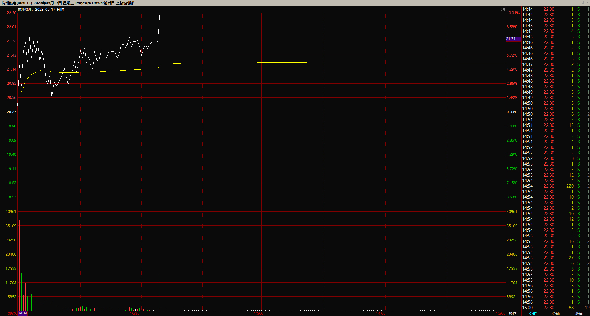 2023年 5月16日20.024元买入,应该是上涨8.6%后买入的,买入数量58400股,当天收盘20.27元,以9.98%涨停,当天浮盈14364.68元;5月17日卖出,收盘价22.3元,收盘涨停板,卖出价不详,看卖出当天的分时,5月17日早盘冲高7%左右,5月17日该笔交易共盈利70542.4元。