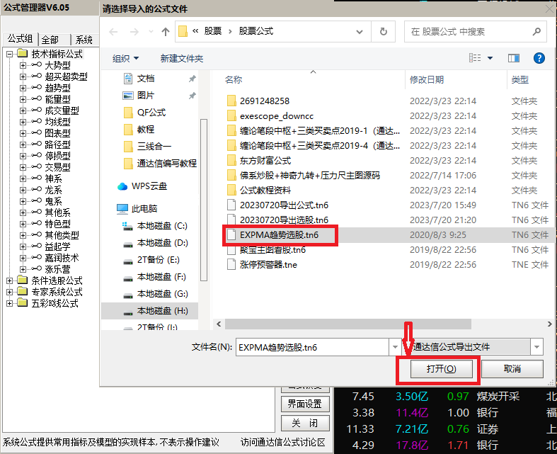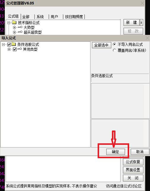 公式管理器界面中,点击“导入公式”→选择“需要测试的公式,例如:EXPMA趋势选股.tn6”选股公式→点击“打开”→点击“确定”,即可完成指标公式的导入。