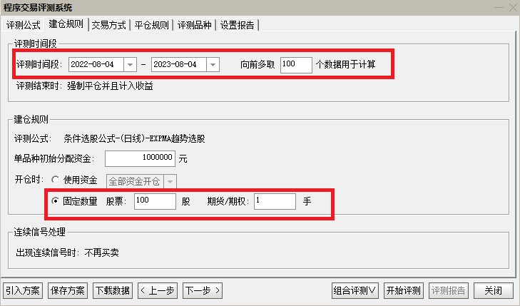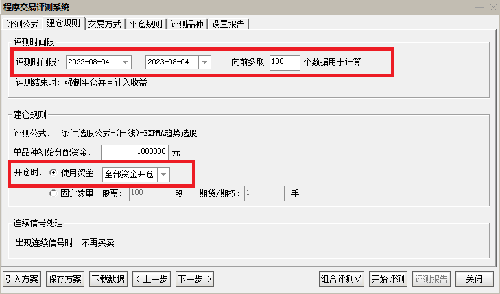建仓规则界面中,设置“评测时间段”及“使用资金”。“使用资金”可设置为“固定数量”或者“全部资金开仓”,如下图所示。