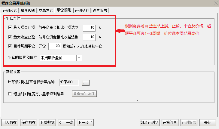 可在平仓规则界面,可设置平仓规则条件,也可按默认设置,如下图所示。