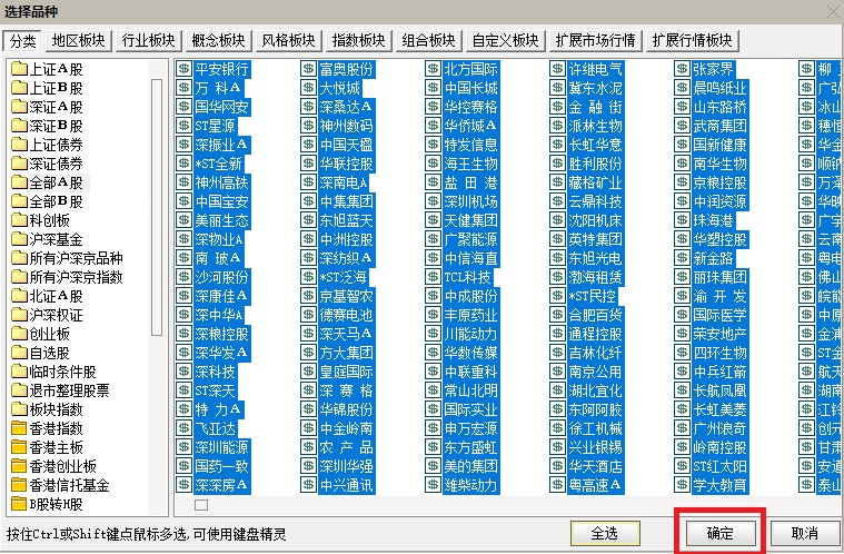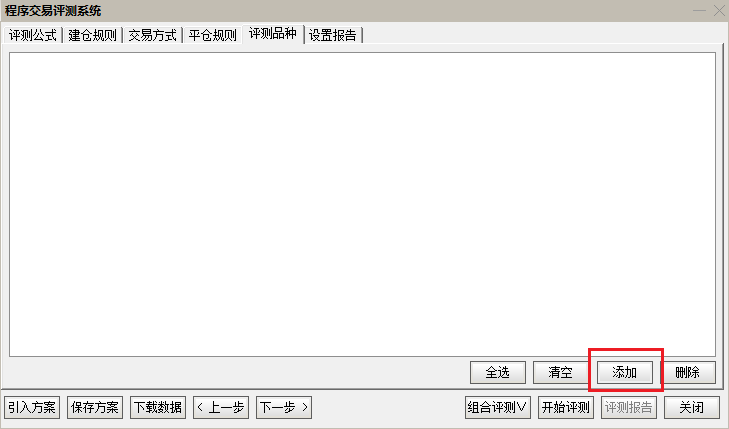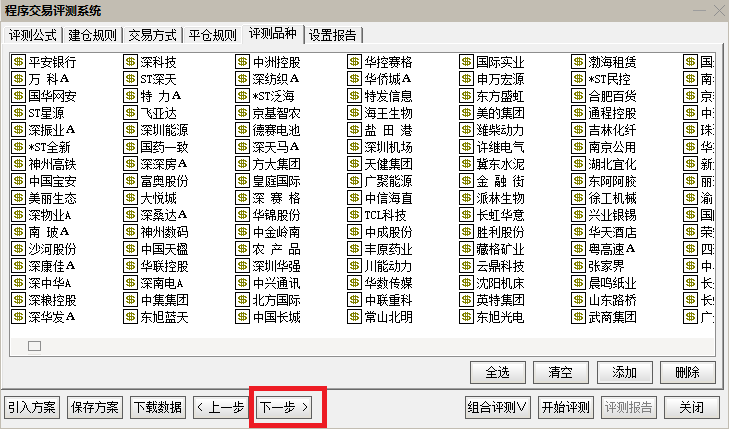 评测品种界面,点击右下方的“添加”→勾选所要评测的品种(一般选“全部A股”)→点击“全选”→点击“确定”,之后,就可选定所以评测的品种,如下图所示