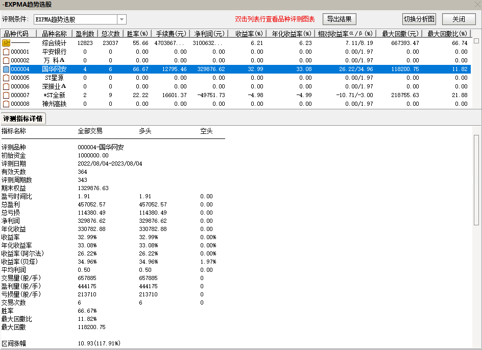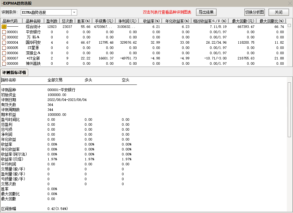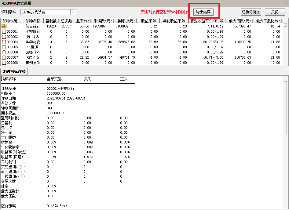 双击综合统计行,进入下面界面,可以看到个股详细分析,导出结果进行查看。