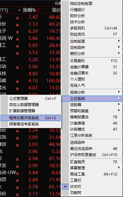 或者使用:“系统”→选择“公式系统”→点击“程序交易评测系统”,就可打开程序交易评测系统。