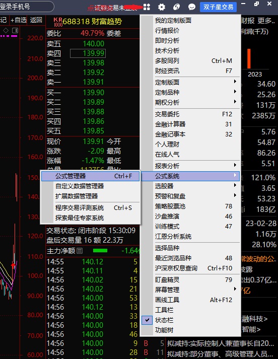 或者使用:“系统(中国银河证券-海王星)”→选择“公式系统”→点击“公式管理器”,就可进入公式管理器界面,如下图所示。通达信金融终端:点击“公式”→点击“公式管理器”,各版本有些差别