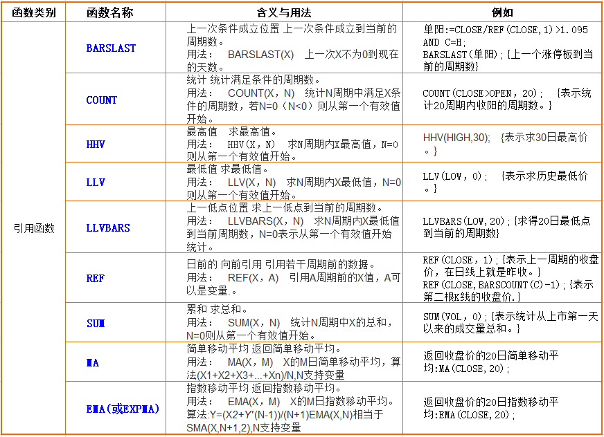 2、定位引用数据:REF (表示日前的,向前引用若干周期前的数据), BARSLAST(上一次条件成立位置 上一次条件成立到当前的周期数),LLVBARS(上一低点位置 求上一低点到当前的周期数);