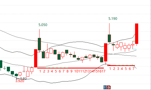 特征:一根带有量的攻击性长阳出现以后,市场人气开始被激励起来。如果市场回调出现抗跌特征,即盘面出现缓跌或者跌不动。那么在回调6-8根K线周期内,就会引发新的暴涨。