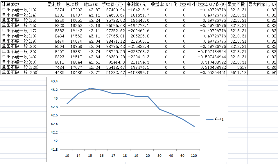 可以看出M等于14,15,16胜率为最高阶段,也就是15天的股价指数平均线角度从下降转为上升后,单阳不破一般的胜率是最高的,但这个胜率还是比较低的。
