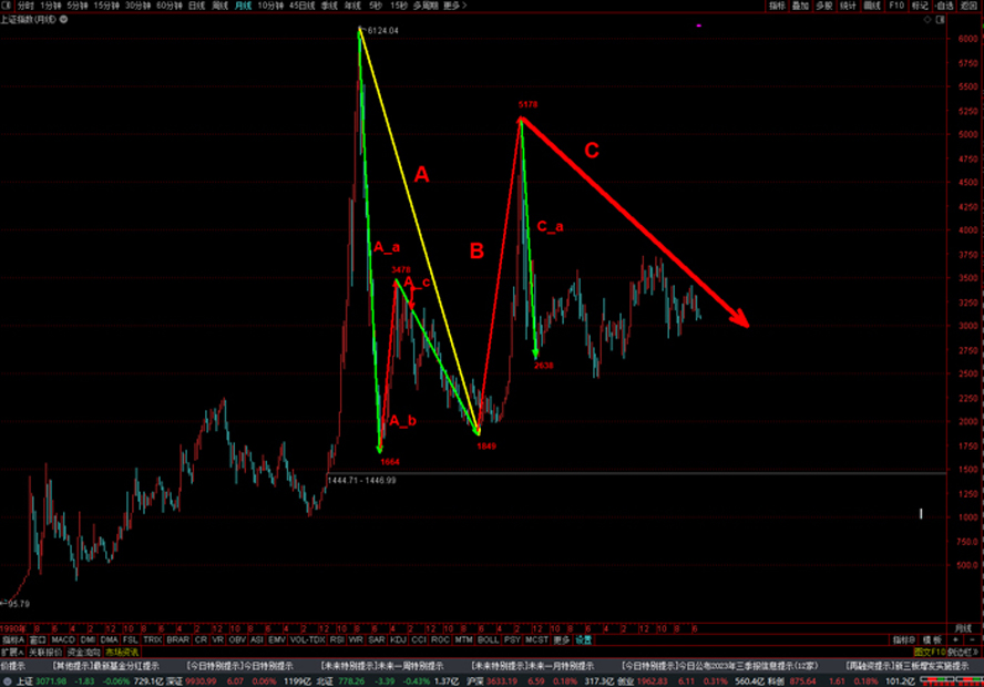 20071016~20130625 区间是大A浪的走势,上证指数从6124跌到1849;大A浪的下跌嵌套了a-b-c子浪的结构,