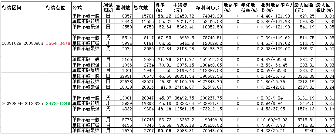 (1)单阳不破选股公式在牛市月线级别胜率比较高,达到71%以上;