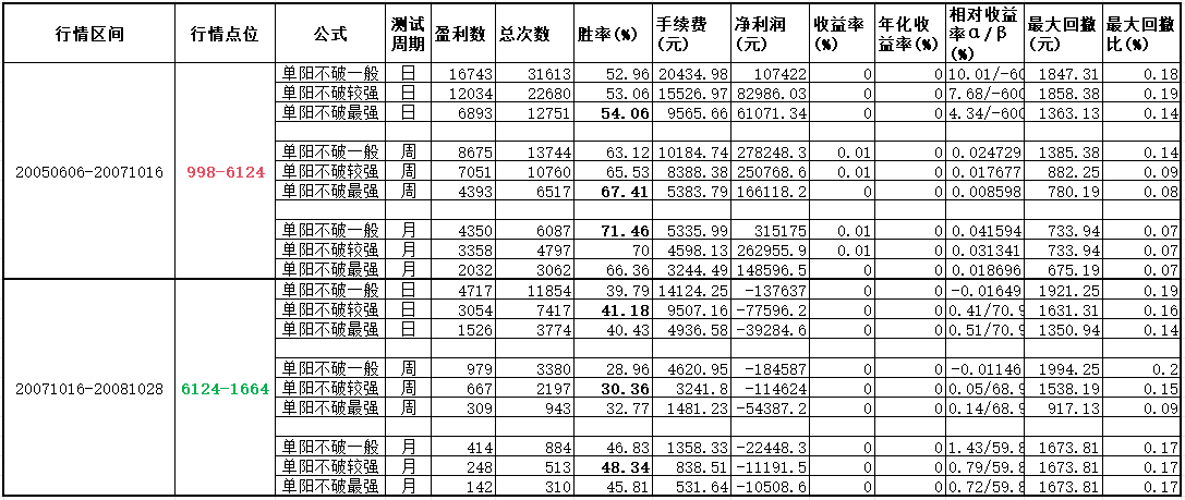要研究提高单阳不破胜率,就是给单阳不破设置一些限定条件,意思就是各种走势阶段下单阳不破的胜率,首先来测试一下2005~2016年历史走势的胜率,选择这一时段测试比较有代表性,