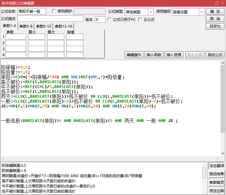 阳涨幅:=3.5; 阳倍量:=1.9; 单阳:=C>O*(1+阳涨幅/100) AND VOL>REF(VOL,1)*阳倍量; 高不破价:=REF(C,BARSLAST(单阳)); 中不破价:=REF((C+L)/2,BARSLAST(单阳)); 低不破价:=REF(L,BARSLAST(单阳)); 两天:=LLV(L,BARSLAST(单阳))>低不破价 OR LLV(L,BARSLAST(单阳))=低不破价; 一般:=LLV(L,BARSLAST(单阳)-2)>低不破价 OR LLV(L,BARSLAST(单阳)-2)=低不破价; E:=ATAN((EMA(C,15)/REF(EMA(C,15),1)-1)*100)*180/3.1415926; 一般选股:BARSLAST(单阳)>6 AND BARSLAST(单阳)<9 AND 两天 AND 一般 AND E>0 ;