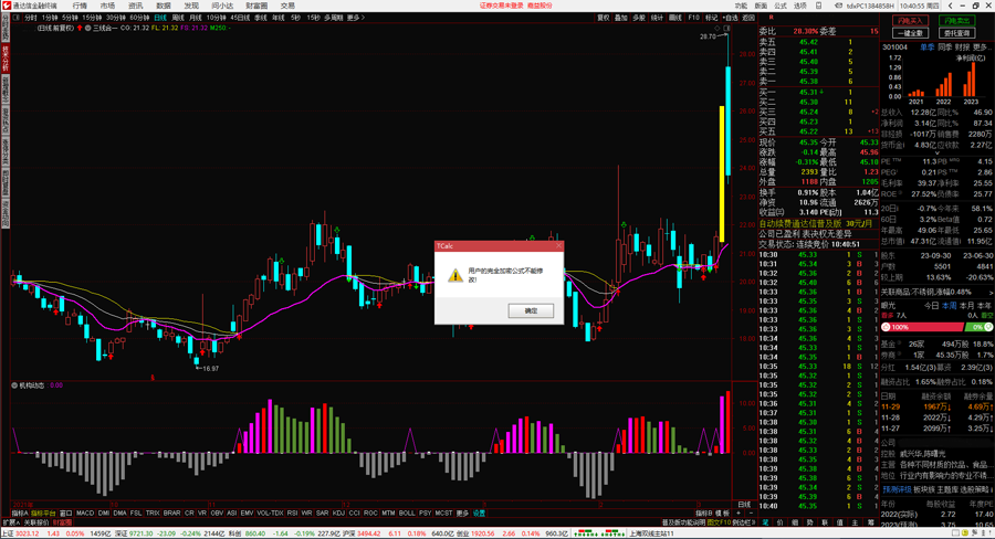 第一次拿到机构动态公式,很是好奇,导入公式后,最着急的是什么?写公司的人,最喜欢的就是看看高手是如何写公式的,就是看到公式源码,导入后,先看副图效果,然后右键点击左边公式名称“机构动态”,弹出修改公式,确定“修改当前公式”,既然是“用户的完全加密不能修改”,有点小失望……