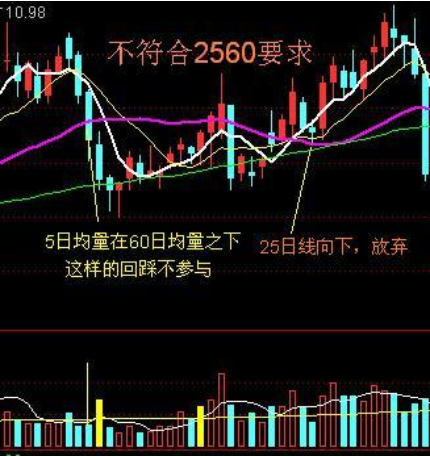 (2)5日均量线应该在60日均量线之上,并且只有同时满足这两个条件的品种,才符合 “2560战法” 的要求,才可以按照如下条件买入。