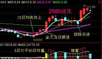 “2560战法”精髓就是:25日均线坚决向上,5日均线上穿或回踩25日均线时,成交量5均量大于60均量就是介入机会,最好此时出现缩量小星线过渡。