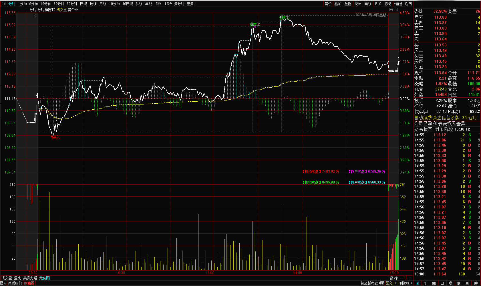 C,LINETHICK2,COLORWHITE; XG:HHV(H,480),DOTLINE,COLORCYAN; RQ:=DATETODAY(DATE)-DATETODAY(REF(DATE,TOTALBARSCOUNT-CURRBARSCOUNT))+1; JY:=BARSLAST((RQ-REF(RQ,1))!=WEEKDAY-REF(WEEKDAY,1) OR TOTALBARSCOUNT-CURRBARSCOUNT=0)+1; MA1:=REF(C,JY); MA2:=REF(MA1,JY); MA3:=REF(MA2,JY); MA4:=REF(MA3,JY); MA5:=REF(MA4,JY); MA6:=REF(MA5,JY); MA7:=REF(MA6,JY); MA8:=REF(MA7,JY); MA9:=REF(MA8,JY); H1:=MAX(DYNAINFO(3),DYNAINFO(5)); L1:=MIN(DYNAINFO(3),DYNAINFO(6)); P1:=H1-L1; 阻力:L1+P1*8/9,COLORLIRED,DOTLINE; 支撑:L1+P1*0.5/9,COLORGREEN,DOTLINE; 均线:IF(BETWEEN(C/(SUM(AMOUNT,0)/SUM(VOL*100,0)),1.05,0.95)=0,MA(C,0),(SUM(AMOUNT,0)/SUM(VOL*100,0))),COLORYELLOW,DOTLINE; DIF:=(EMA(CLOSE,12)-EMA(CLOSE,26))+DYNAINFO(3); DEA:=EMA(DIF,9); MACD1:=10*(DIF-DEA); MACD2:=EMA(MACD1,2); STICKLINE(MACD1>=MACD2 AND MACD1>=0,DYNAINFO(3),MACD1+DYNAINFO(3),0,-1),COLORLIGRAY; STICKLINE(MACD1<MACD2 AND MACD1>0,DYNAINFO(3),MACD1+DYNAINFO(3),0,-1),COLORLICYAN; STICKLINE(MACD1>=MACD2 AND MACD1<0,DYNAINFO(3),MACD1+DYNAINFO(3),0,-1),COLORLIGRAY; STICKLINE(MACD1<MACD2 AND MACD1<0,DYNAINFO(3),MACD1+DYNAINFO(3),0,-1),COLORLIGREEN; XX:=SUM(AMOUNT,BARSCOUNT(CLOSE))/SUM(V*100,BARSCOUNT(CLOSE)); 主力:=EXPMA(CLOSE/XX,20);大户:=EXPMA(CLOSE/XX,60);散户:=EXPMA(CLOSE/XX,120); 底:=1;1.022,NODRAW;高:=1.033; DRAWTEXT(CROSS(主力,1.02),C*0.999,' 拉'),COLORMAGENTA; DRAWICON(CROSS(主力,1.04),C,45); DRAWTEXT(CROSS(主力,1.04),C*0.999,' 冲'),COLORRED; A1:=(VOL/CLOSE)/3; A2:=SUM((IF(((A1>40) AND (CLOSE>(REF(CLOSE,1)))),A1,0)),0); A3:=SUM((IF(((A1>40) AND (CLOSE<(REF(CLOSE,1)))),A1,0)),0); A4:=SUM((IF(((A1<40) AND (CLOSE>(REF(CLOSE,1)))),A1,0)),0); A5:=SUM((IF(((A1<40) AND (CLOSE<(REF(CLOSE,1)))),A1,0)),0); A6:=((A2+A3)+A4)+A5; A7:=IF((BARSTATUS=2),((100*A2)/A6),0); A8:=((IF((BARSTATUS=2),((100*A3)/A6),0))); A9:=((IF((BARSTATUS=2),((100*A4)/A6),0))); A10:=((IF((BARSTATUS=2),((100*A5)/A6),0))); DRAWTEXT(LONGCROSS(支撑,C,2),C-0.01,' 买入'),COLOR0000FF; DRAWICON(LONGCROSS(支撑,C,2),C-0.01,1); STICKLINE(LONGCROSS(支撑,C,2),C,阻力,0,-1),COLORCYAN; DRAWTEXT(LONGCROSS(C,阻力,2),C+0.01,' 卖出'),COLORGREEN; DRAWICON(LONGCROSS(C,阻力,2),C+0.01,45); STICKLINE(LONGCROSS(C,阻力,2),C,支撑,0,-1),COLORRED; 量价:=(VOL/CLOSE)/3; B2:=SUM((IF(((量价>0.20) AND (CLOSE>(REF(CLOSE,1)))),量价,0)),0); B3:=SUM((IF(((量价>0.20) AND (CLOSE<(REF(CLOSE,1)))),量价,0)),0); B6:=B2+B3;DD1:=1;比:=B2/B3; D1:=YEAR AND MONTH AND DAY; BA1:=STRCAT(CON2STR(YEAR,0),'年'); BA2:=STRCAT(CON2STR(MONTH,0),'月'); BA3:=STRCAT(CON2STR(DAY,0),'日'); BA4:=STRCAT('星期',IF(WEEKDAY=1,'一',IF(WEEKDAY=2,'二',IF(WEEKDAY=3,'三',IF(WEEKDAY=4,'四',IF(WEEKDAY=5,'五',IF(WEEKDAY=6,'六','日'))))))); AA:=STRCAT(STRCAT(STRCAT(BA1,BA2),STRCAT(BA3,BA4)),''); DRAWTEXT_FIX(D1,0.905,0,0,AA),COLORGRAY; WA1:=V*C/100; WA2:=SUM((IF(((WA1/8>20) AND (CLOSE>(REF(CLOSE,1)))),WA1,0)),0); WA3:=SUM((IF(((WA1/8>20) AND (CLOSE<(REF(CLOSE,1)))),WA1,0)),0); WA4:=SUM((IF(((WA1/8<20) AND (CLOSE>(REF(CLOSE,1)))),WA1,0)),0); WA5:=SUM((IF(((WA1/8<20) AND (CLOSE<(REF(CLOSE,1)))),WA1,0)),0); WA6:=((A2+A3)+A4)+A5; WA7:=IF((ISLASTBAR),((100*WA2)/WA6),0); WA8:=IF((ISLASTBAR),((100*WA3)/WA6),0); WA9:=IF((ISLASTBAR),((100*WA4)/WA6),0); WA10:=IF((ISLASTBAR),((100*WA5)/WA6),0); 机构买盘:=(WA2); 机构卖盘:=(WA3); 散户买盘:=(WA4); 散户卖盘:=(WA5); DRAWTEXT_FIX(1,0.752,1-0.088,0,STRCAT(STRCAT('【机构买盘】',CON2STR(机构买盘,2)),' 万')),COLORRED; DRAWTEXT_FIX(1,0.752,1-0.001,0,STRCAT(STRCAT('【机构卖盘】',CON2STR(机构卖盘,2)),' 万')),COLORGREEN; DRAWTEXT_FIX(1,0.883,1-0.088,0,STRCAT(STRCAT('【散户买盘】',CON2STR(散户买盘,2)),' 万')),COLORMAGENTA; DRAWTEXT_FIX(1,0.883,1-0.001,0,STRCAT(STRCAT('【散户卖盘】',CON2STR(散户卖盘,2)),' 万')),COLORCYAN;