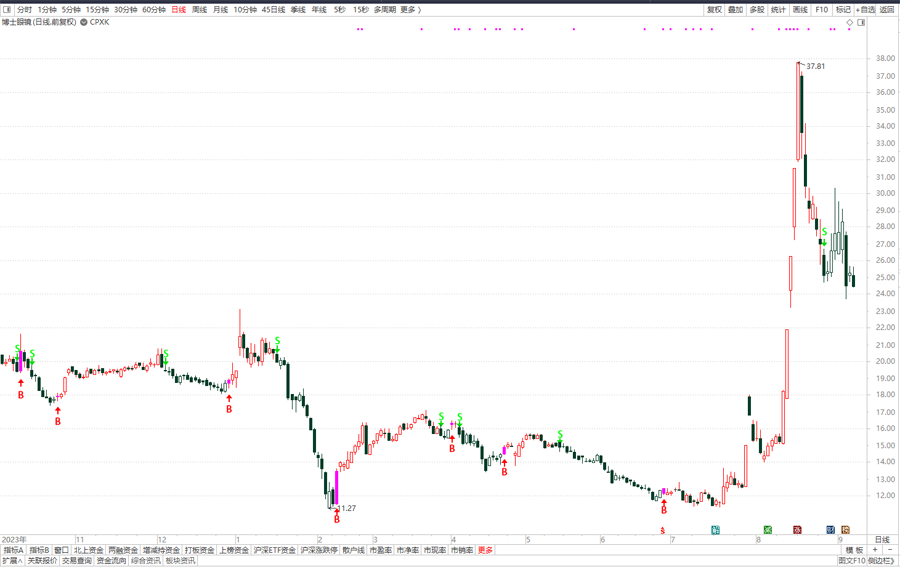 (6)K线下标B为开始做多信号,S为做空信号,这两个信号在横盘震荡和阴跌趋势形态,会有反复变化